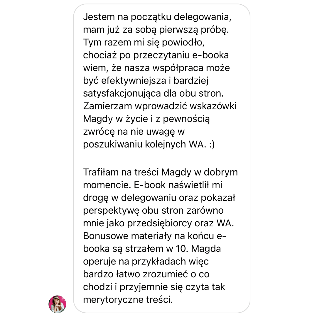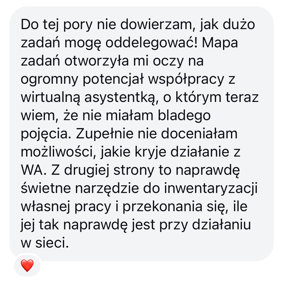 Dzięki delegowaniu stworzyłam 60 godzin kursu dla wirtualnych asystentek, zrealizowałam osiem edycji mentoringów grupowych, a nadal obsługuję kilkunastu klientów bez straty na jakości.
